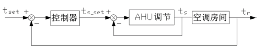 外部调节回路为室温调节过程,即计算回风温度与其设定值之差,通过适当的控制算法(例如PID算法),确定送风温度设定值。这个调节过程的时间步长较长(例如300秒);